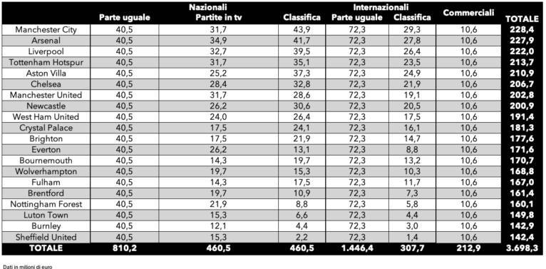 其中意甲前三收入国米(1.01亿欧)、米兰(8740万欧)、尤文(8670万欧)。而英超上赛季降级的三支队的转播权收入都远超意甲前三,卢顿(1.498亿欧)、伯恩利(1.429亿欧)、谢菲尔德联(1.424亿欧)。